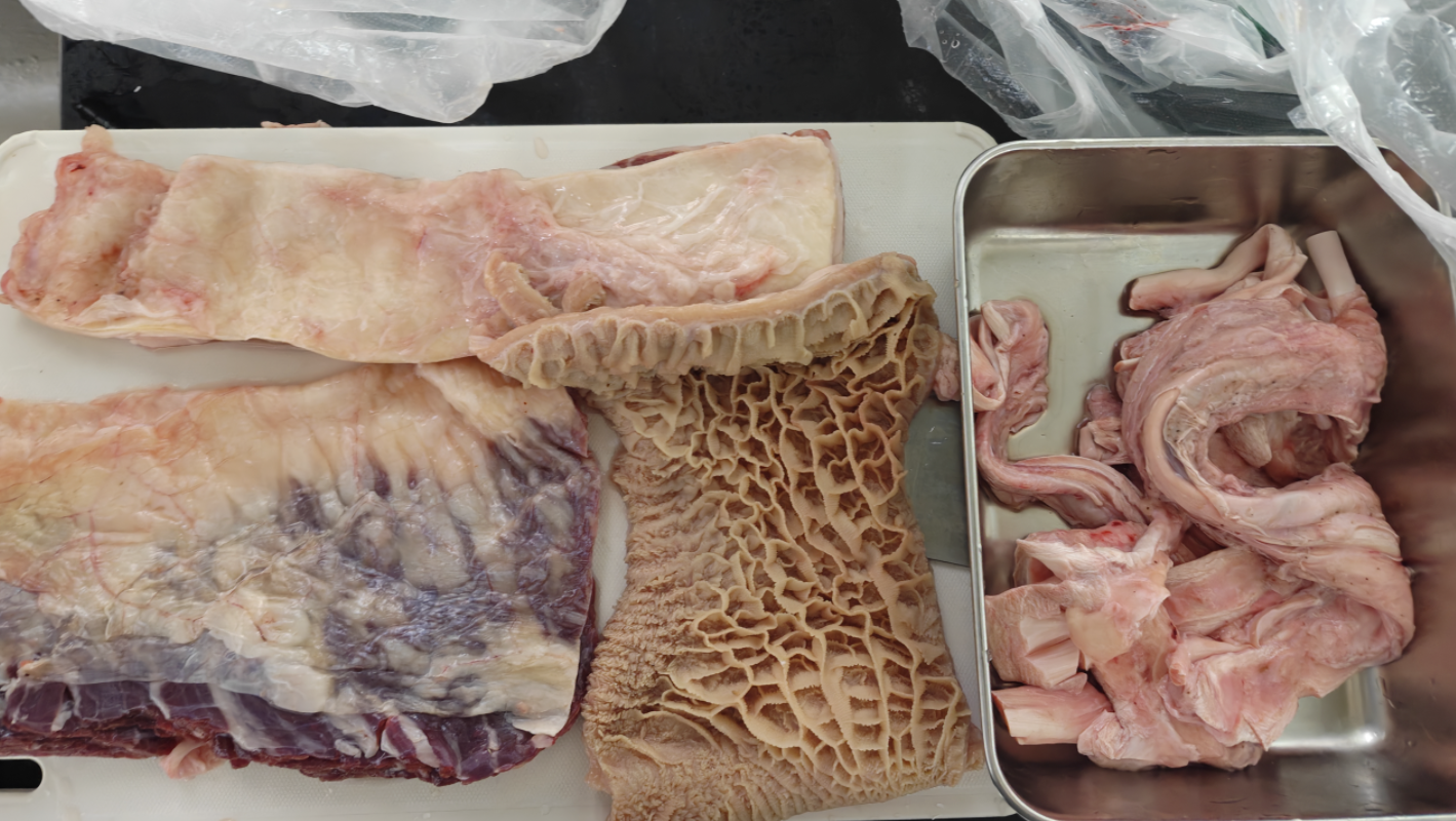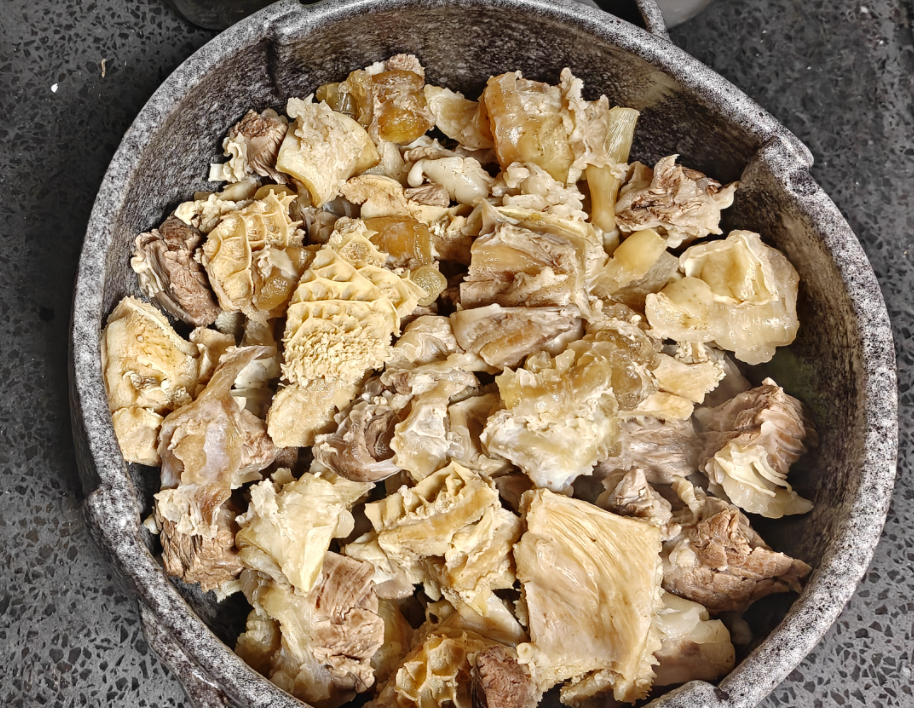 最难清理的是牛肉,而其中牛腩基本不需要怎么清理,清理掉上面的血块儿以后,就可以切块,我切的大概是4cm左右的方块,炖煮之后稍微有一点小,但能炖透味道。金钱肚的清洗就麻烦很多,和很多人买到黑色的牛肚不同,我们从菜市场买的金钱肚其实已经是白色了,但是还是要做处理。锅中烧水,在冒气泡(大约 80° 左右)的时候关火,用温水烫一下牛肚,还是会散发很腥臭的味道。取出用铁勺子刮下表面的油膜,油膜去除以后味道就减弱了很多。牛筋因为买错了,所以处理起来比较复杂,用剪刀处理,也稍微烫了一下,剪去看起来不能吃的部分,味道很大,切开牛筋的精髓,防止不好煮。