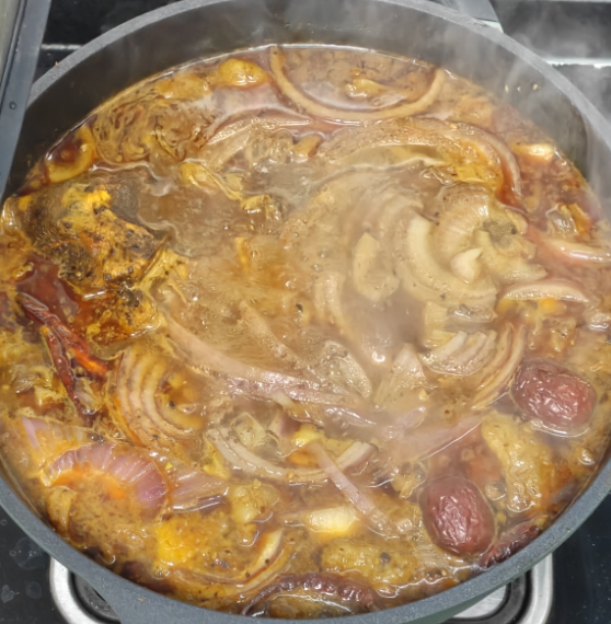 继续翻炒下,很快就可以加入之前焯水的牛肉汤。放入5段干辣椒和少许冰糖。其实这里已经不需要放香料,但是我比较喜欢加入爱吃的香料调味,所以额外放了一个香料包,包括丁香、白芷、肉豆蔻、陈皮、桂皮、红枣、山楂等。
