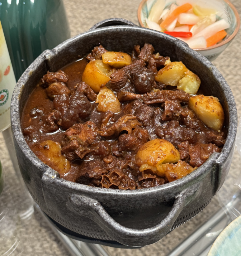 成品口感不负众望,极为好吃,很像澳门吃过的味道。我们蒸了米饭。其实这样的咖喱很适合吃竹升面。有机会再做。2斤牛肉加6两左右的土豆对两个人来说有点多了,还炒了一个拿手的黄油青菜,牛腩剩了一半,土豆吃完。明天还可以回锅继续吃一顿。