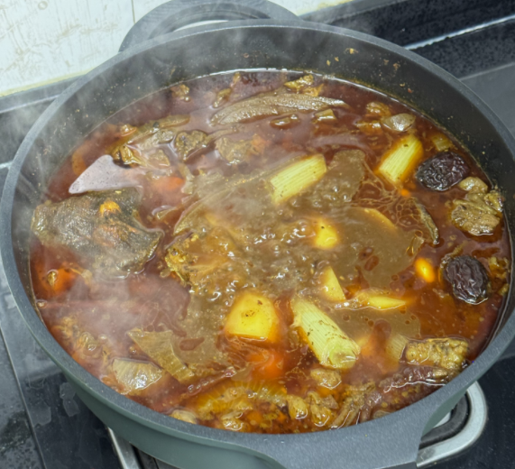 炖大概一个小时,放入土豆,喜欢吃蒜的还可以在这时也放一些蒜,这样不会化掉,炖半个小时,开始准备收汁,因为汤放的比较多,所以我收汁也收了很久,大概收了半个小时。