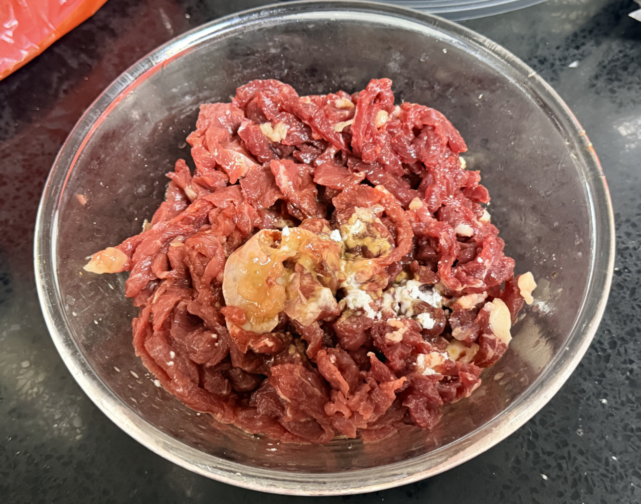牛肉腌制:牛肉用淀粉、酱油、料酒、五香粉抓匀腌制20分钟。
