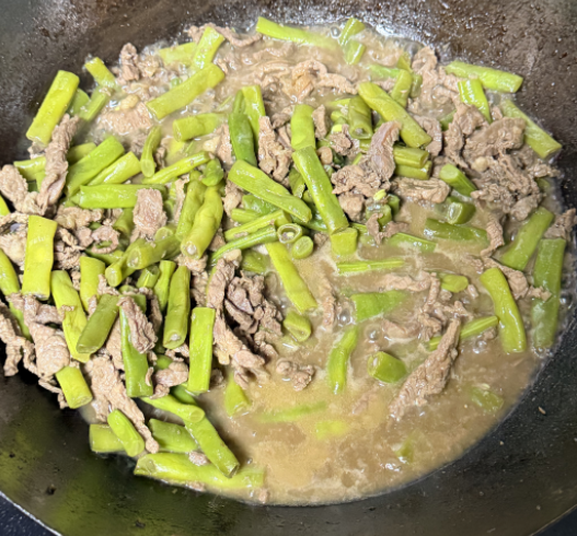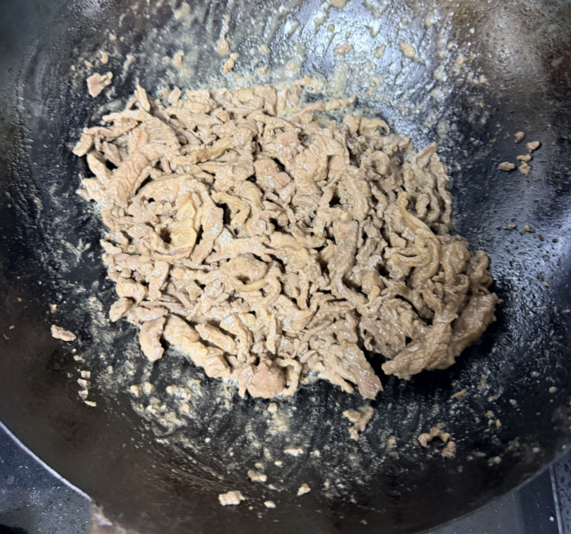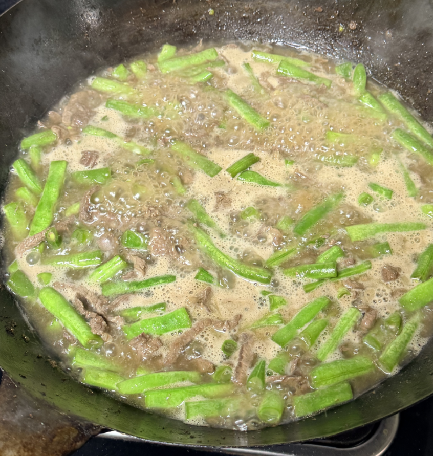 热锅冷油下牛肉。因为铁锅有段时间没用,所以把锅洗了之后烧热加了油,所以油温比较高,导致牛肉进去以后就开始粘锅。不过这个也没关系。牛肉炒到差不多的程度就加入四季豆,稍微炒制后,加入酱油、味精、盐。同时烧一锅开水,加入开水炖熟。