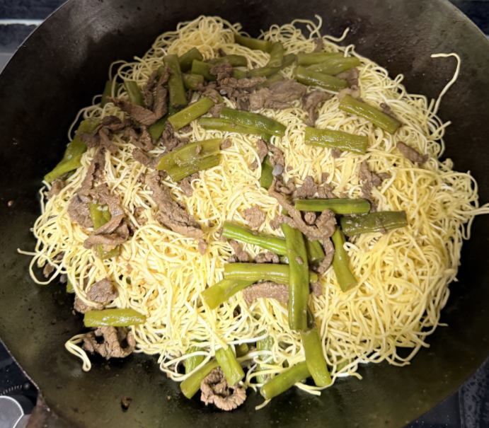按照从下往上“菜-面-菜-面-菜” 把抖散的细面一半。平铺在留在锅中的肉丝豆角上,然后再将盛出的一半豆角较为均匀地撒在面上,连同汤汁。再铺最后细面,然后剩下的菜和汤汁均匀撒上