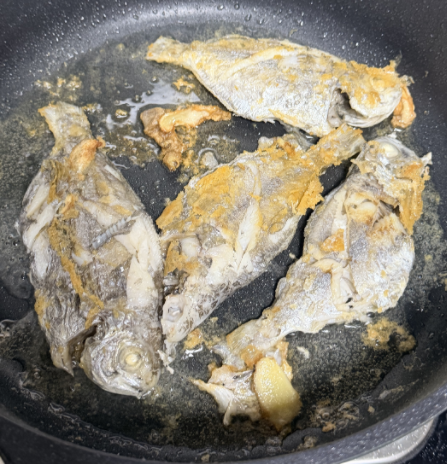 锅烧热,加入油和姜片,可以稍微多一点。然后放入鱼后中小火煎制,要有耐心,不要急着动鱼。大概5分钟以后,再慢慢晃锅,让鱼和锅分离。我这里有些操之过急,所以鱼皮粘在了锅上。
